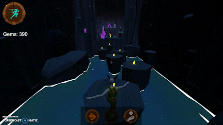 To introduce the player to the blink mechanic, I placed a gem of a visibly different colour (green) on a far platform that the player cannot reach by jumping, encouraging them to reach the gem using their spells. I did this to show the player that there was a way to get to locations they couldn't jump to.